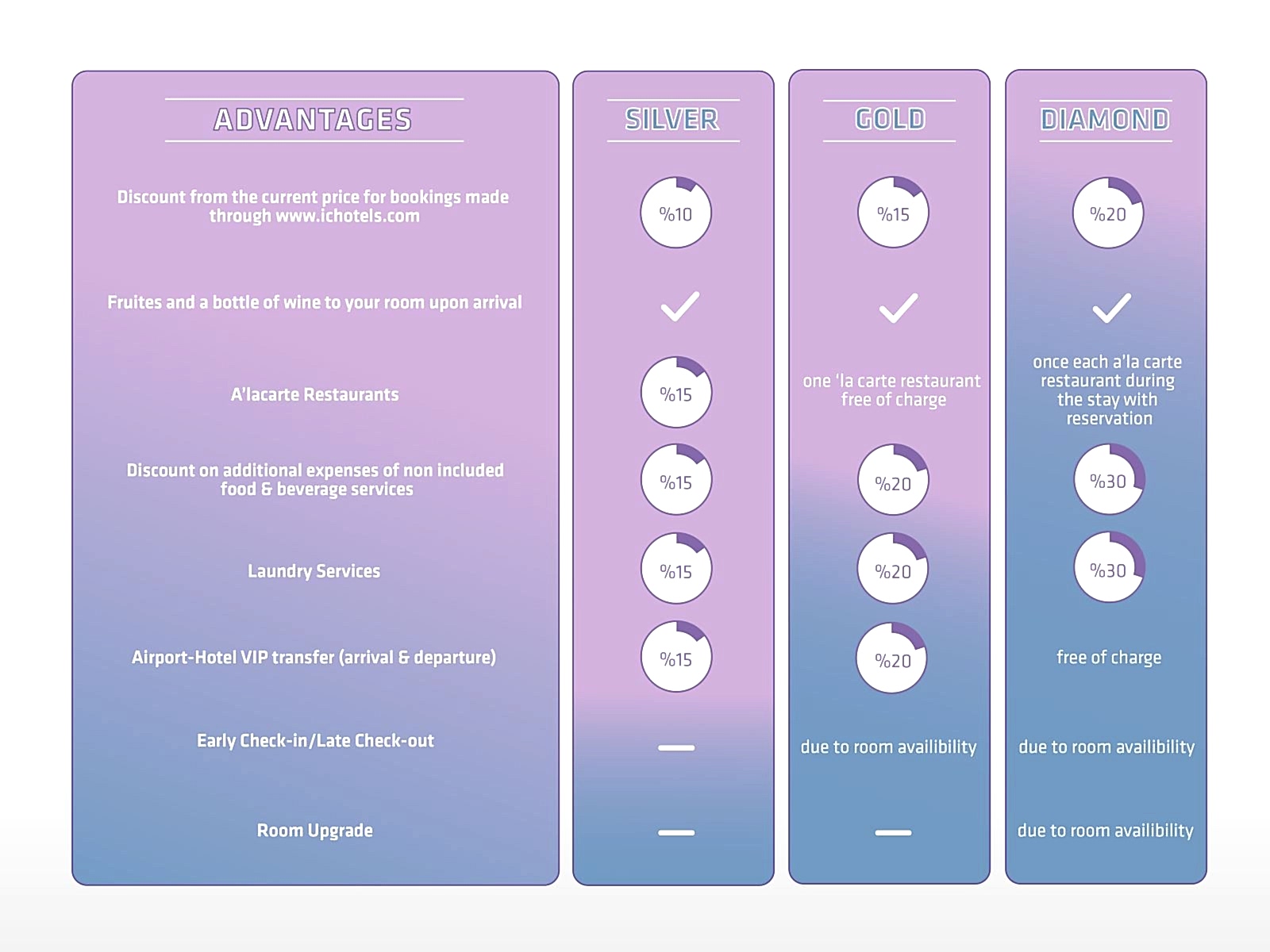 It is our pleasure to present you the IC Experience Loyalty program. With your loyalty program membership, you are privileged at IC Hotels. You will be able to join IC Experience Loyalty without any registration, already with your first accommodation. Silver, Gold and Diamond Card benefits will be offered according to your score during all your stay in IC Hotels.